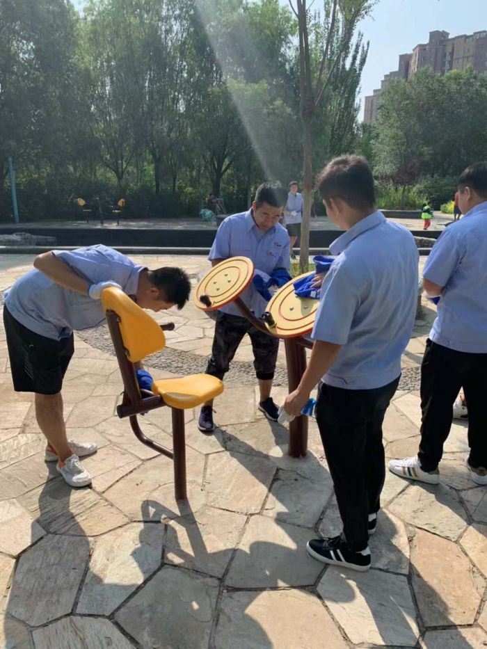 团员们分为三组,分别清扫公园内的卫生死角,捡拾绿化带内枯叶杂草、烟头垃圾,擦拭公园内的座椅、公共器材、路灯及广告宣传栏,铲除公园路面上的非法小广告。