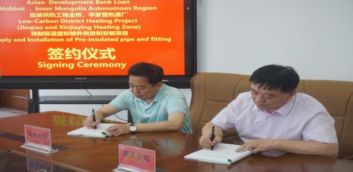7月7日上午,内蒙古呼和浩特市低碳供热亚行贷款项目——呼和浩特市城发投资有限责任公司金桥、辛家营区域集中供热工程第7包(金桥热源厂预制保温管和管件3)、第9包(辛家营热源厂预制保温管和管件2)采购合同签约。
