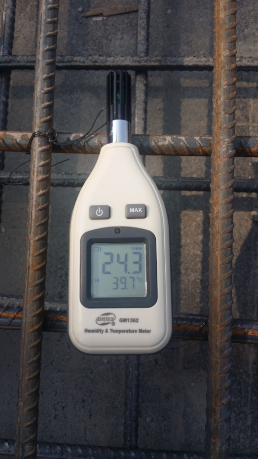 2017年7月18日上午10:30左右,呼和浩特市低碳供热亚行贷款项目——辛家营热源厂中继泵房蓄水池墙体和消防泵房梁柱开始浇筑,此时施工现场温度为39.7℃。