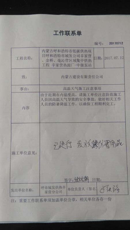 为此,工程自3月31日开工以来,全体参加建设的单位和个人,克服种种困难,加班加点,在保证安全和质量的前提下,为确保今冬按时投运而努力施工;尤其是近日持续高温以来,为既能确保施工人员的安全,又能确保工期不后延,施工方采取了早上工,晚收工,午增加休息时间,给施工人员熬制防暑绿豆汤等办法,从而保证了施工有效时间,确保工期没有任何延误。同时,我分公司为保证暑期施工人员安全,及时给施工单位下发了《工作联系单》,对高温天气施工提出要求,并要求施工单位有具体防暑措施。