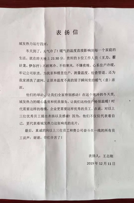 这封感谢信的背后凝聚了城发供热人为提高供热质量和服务付出的汗水和努力。12月10日晚21:30分,运营四所王力、翟计龙、伊尔汗三名同志不畏严寒,深夜入户,一个单元一个单元检查供热管道,挨家挨户上门测量温度,为温度偏低的用户清洗滤网,集中处理阳光美居小区客服问题,受到热用户的肯定和好评。