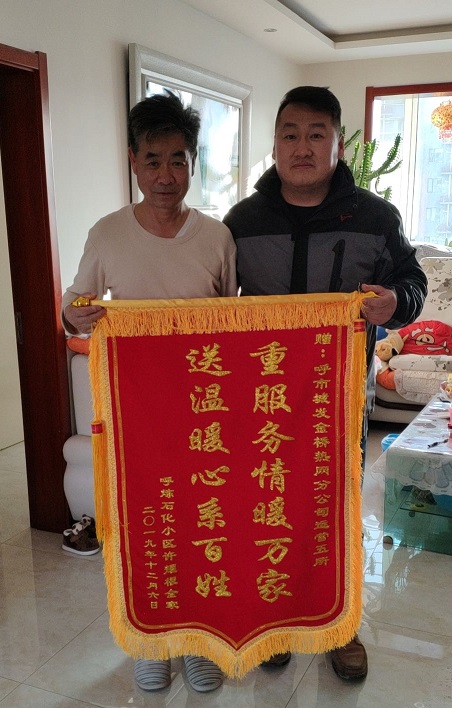 12月24日,呼炼石化小区热用户许耀根将写有“重服务情暖万家 送温暖心系百姓”的锦旗送到了金桥热网分公司运营五所运行所长周峰手中。
