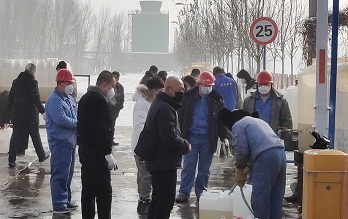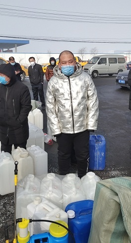 1月31日清晨接到通知可以领到免费的次氯酸钠。早晨不到8点综合办两名男同事就驱车前往距离市区30公里以外的三联化工厂,不到9点那里就已经排起了长队。数九寒天综合办两名小伙子就在三联化工厂门口排了近四个小时的队伍,终于为桥靠分公司领到了125公斤的次氯酸钠。看着他们不顾自己冻到发紫的脸庞,满心欢喜的告诉我们终于领到了,心中的一颗大石头也落地了。接下来的任务是综合办还要负责把这125公斤的次氯酸钠稀释120倍变成84消毒液之后,才能发放给大家,关键时刻能人倍出,综合办的小伙子不仅能扛得起重物,还得有个计算机的头脑。功夫不负有心人,125公斤的次氯酸钠精确的被稀释为1500公斤的84消毒液,在这同一天为大家发放下去。