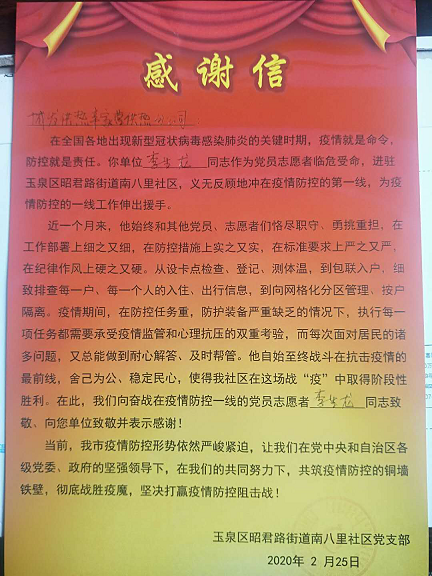 为筑牢疫情防控的严密防线,有效防止疫情扩散蔓延,南八里社区成立万锦香颂临时党支部,他很荣幸的成为其中的一员。他第一时间配合社区工作人员和物业进行小区封闭管理,在小区出入口设立疫情防控检查点和出入登记处,并悬挂条幅、设置宣传牌、发放传单、引导社区居民不串门、不走动避免人群聚集。让他感动的是小区居民也给予了大力支持,暖心的话语,让他在寒冷的冬季感受到了温暖。