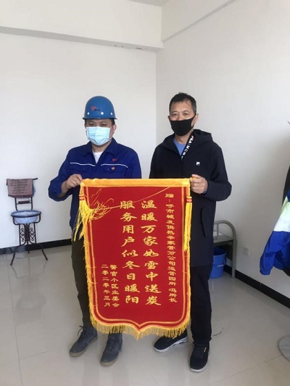 4月10日上午,警官小区业委会代表将写有“温暖万家如雪中送炭, 服务用户似冬日暖阳”的锦旗送到辛家营供热分公司运营四所蒙校热力站,向辛家营分公司辛勤的工作人员表示感谢。