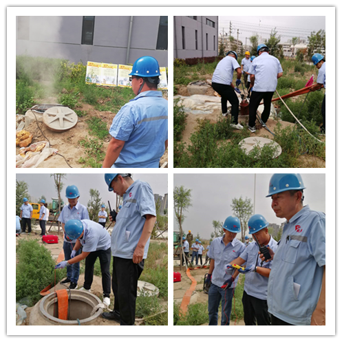上午9:40应急演练正式开始。运行人员在日常巡检时发现一处流量计井出现大量蒸汽,并立即通知调度,调度了解情况后,迅速通知检修车间立即赶往现场,检修人员携带抢险工具迅速赶赴事故现场。根据现场人员的初步判断为流量计法兰连接处漏水,并将此情况立即报告调度及公司领导,随后现场指挥人员按照应急预案,并根据有限空间“先通风、后检测、再作业”的要求,抢险人员佩戴井下作业个体防护用品,开始进行抢修工作,通过60分钟紧张有序的作业,法兰处漏水问题解决,事故排除,演练结束。