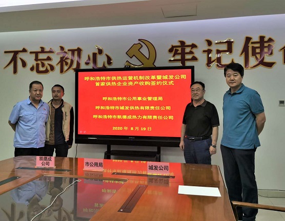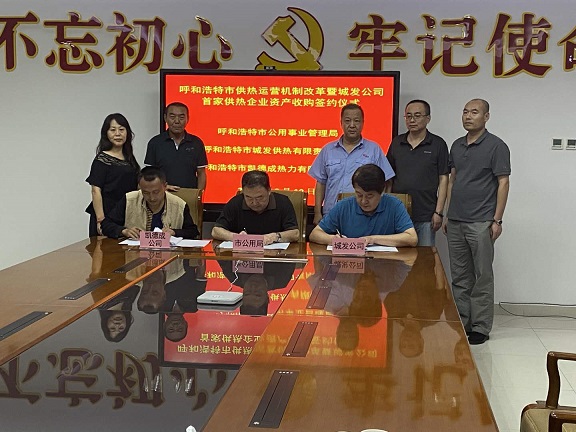 8月19日下午17时30分,呼和浩特市供热运营机制改革暨城发公司首家供热企业资产收购签约仪式在城发公司九楼会议室举行。市住建局副局长刘宏军,市公用事业管理局局长孙敬华、副局长云俊义,城发公司总经理吕德育、副总经理吴利勤,凯德成热力公司股东代表郄文华,北京(呼和浩特)德和衡律师事务所和内蒙古安立信资产评估有限责任公司等人员参加了签约仪式。