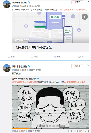 9月15日通过微信公众号平台推送呼和浩特市网络安全宣传周海报,号召大家积极参与有奖问答、线上参观,观看线上论坛、讲座等活动。9月16日分公司开展个人信息保护日活动,通过微信公众号平台推送个人信息保护日系列微课微视频,向大家普及网络安全的重要性。
