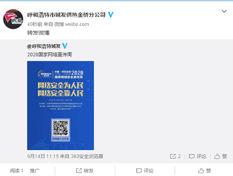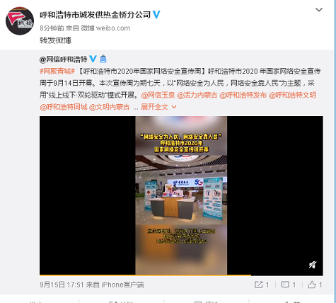 还通过悬挂横幅、微信、微博公众号等平台开展宣传“呼和浩特市2020年国家网络安全宣传周”活动,宣传网络安全知识及相关法律法规。目的就是要深入宣传贯彻习近平总书记关于网络强国的重要思想,进一步贯彻落实习近平总书记在全国网络安全和信息化工作会议上的重要讲话精神,深入宣传普及网络安全知识。