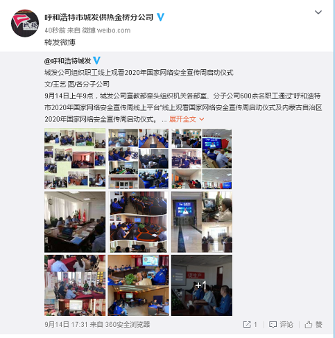 9月14日上午,金桥热网分公司组织职工观看了“呼和浩特市2020年国家网络安全宣传周线上平台”国家网络安全宣传周启动仪式和内蒙古自治区2020年国家网络安全宣传周启动仪式。