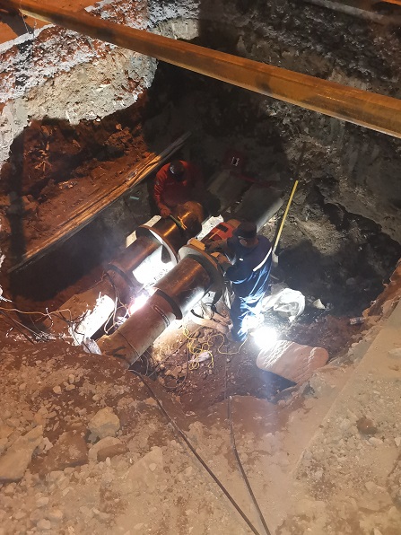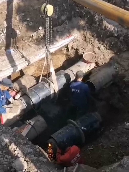 分公司按照管网抢修预案,组织安排检修人员即刻关阀门泄水,还组织保运抢修单位对漏点处进行开挖。在管网漏点处,发现DN350管道固定节腐蚀损坏,出现多处漏点,需更换固定节。整个工作现场忙而有序进行,3个焊工同时作业,切割、拆旧、对接、焊接一气呵成。