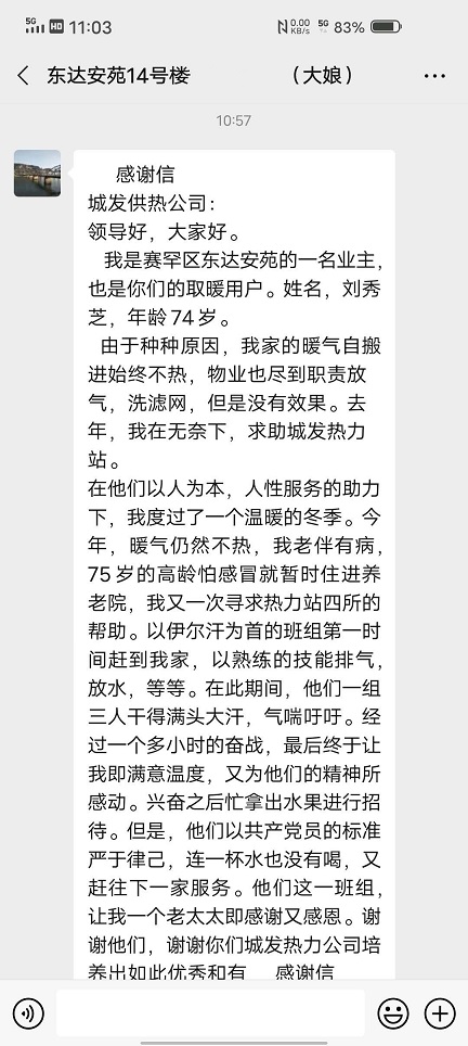 10月21日上午,城发供热辛家营分公司供热辖区的东达安苑小区14号楼1单元刘秀芝老人送来了一封感人至深的感谢信,由于老人年岁已高,以微信传达的形式表达了对运营四所客服人员的感谢。