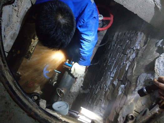 在走访121号楼一单元一楼西户时发现,卫生间的供热管路存在疑似跑水故障。这时候已经是晚上将近9点了,工作人员在漆黑的夜幕下,两人一组钻进地沟,查找跑水的原因。经过几经折腾,最后发现,是因为该小区是老小区,供热管网老化严重,供热管道的焊点正好在地砖隐蔽处存在老化漏点,导致跑水现象。工作人员现场暂时关闭了供热环路阀门,因为需要焊接,与用户约定白天时进行维修更换。