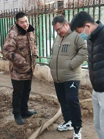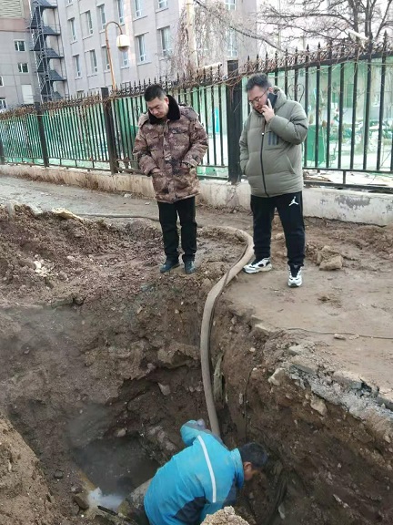 抢修人员调集挖掘机进入现场开挖,该区域供热二次管网星罗密布,错综复杂。根据现场情况及周边热力站补水情况判断为储运热力站机组供热区域,漏点挖出后发现是DN300主管道崩裂。由于管道漏点太大需泄水作业,但该热力管道无支线阀门无法控制,最终决定热力站停泵泄水抢修,影响该区域供热面积约15万㎡。经过抢修人员“连续作战”12小时,于晚上10点抢修完毕,开始站内注水,凌晨1点启泵恢复供热。