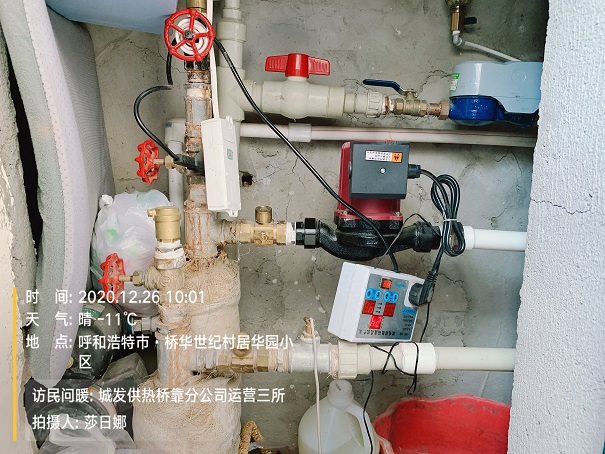 12月26日,访民问暖小组来到居华园小区走访,走访中发现有一户用户管道井内安装了电子循环泵,对用户家情况询问了解后得知,该用户家中有婴儿,家中大人担心婴儿冬季在家冻着,于是在没有对供热情况做过了解的情况下,就急于安装了循环泵,并且入冬就开启,一直在使用中。桥靠运营三所乔树所长现场对这个用户家所在的单元供热管网进行查看,对邻居的管道井内温度和楼道的立管温度观察后得出结论,安装循环泵的用户家,循环泵的开启,对室温帮助不大,反而时间久了会对邻居家的温度造成影响,给用户耐心解释后,用户答应将循环泵关闭。居华园还一用户反映不热,访民问暖小组专程去了这户不热用户家,先排除管道井内集气和堵塞现象,然后进入用户家中,对分集水器逐环路进行排查,放水。最后发现有两个环路,回水没有温度。经过分析,最后确认为分水器内堵塞,需要拆除分水器进行疏通或更换。由于用户是两个老人,不懂怎样购买配件,副经理刘婷和乔树所长现场决定,由工作人员带上所需的配件,上门为二位老人家中的分集水器做整改,整改后要对老人的家中供暖情况做到跟踪了解,让老人过上暖和的冬天。老人说,虽然家中暂时还没热,但心里是暖的。