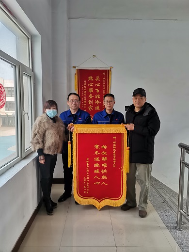1月25日上午,城发辛家营供热分公司运营二所全体工作人员收到了绿地塞尚公馆三四期热用户赠送的书写着“排忧解难供热人,寒冬送热暖人心”的锦旗。