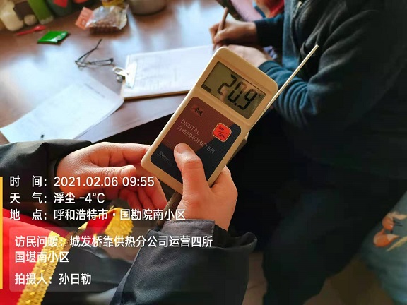 临近春节,桥靠分公司运营四所一线工作人员,对辖区内老旧小区的供热情况进行了走访,并对还未交费的用户逐户入户,上门进行催费,张贴到访不遇单及催费单。在走访中,未发现有温度不达标用户,所走访的用户对室内温度很满意,经过测温,平均温度为21℃。