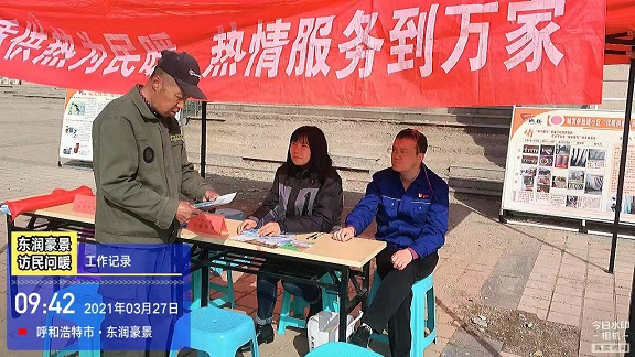 3月27日辛家营分公司客户服务处、运营三所全体工作人员组织开展了“2020-2021采暖季第二十次‘访民问暖’专项活动”。本次活动来到了东润豪景小区,共计走访用户20户,填写了《访民问暖记录表》6份、《居民供热问卷调查表》11份、发放城发供热服务手册9本。