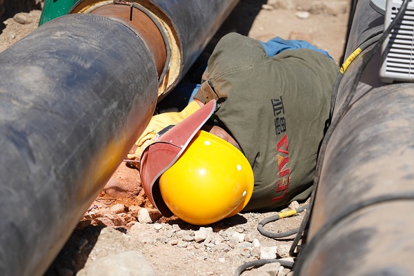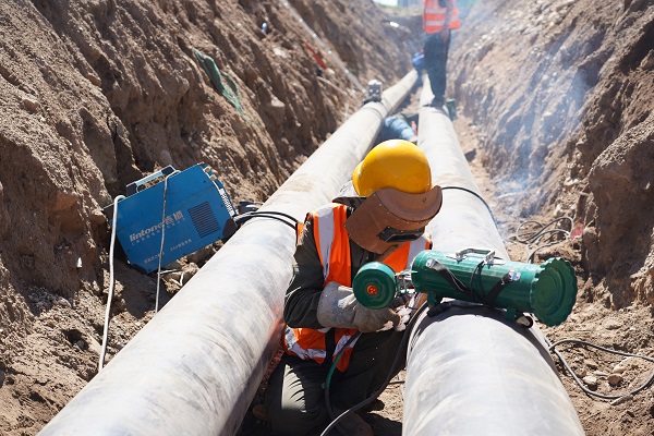 一个工人师傅,侧身躺在两个管道中间的狭小夹缝中,对管道进行焊接。施工单位天津管道公司的段步雨向笔者介绍,“现在这个师傅做的是第二道工序,叫电焊造面。你看到这么长的管子,都是一截一截焊接起来的,焊接要两道工序,第一道是氩弧焊打底,就是在电弧焊的周围通上保护气体——氩气,使焊材不能和空气中的氧气接触,从而防止了焊材的氧化,所以第一遍要用氩弧焊,就是为了焊口不生锈,确保它的使用年限。氩弧焊完成后,为了管道外壁齐平,焊口更牢靠,再进行第二遍电焊造面。”