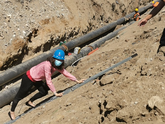 笔者带好安全帽,也顺着工人们下沟的唯一路径——一个近乎垂直立在沟边梯子下到沟里,每走一步,周围的土就在“簌簌”的往下掉,笔者的心也跟着这些土渣心惊胆战。来到管道沟里,两根粗粗的管子并排向远方延伸去。管沟虽然深,但是并不宽,作业空间不大。