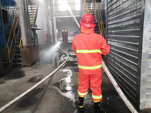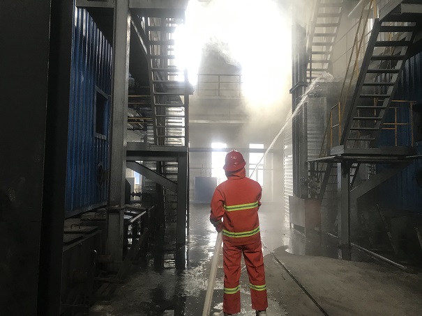 演练开始前副经理郑红飞进行了动员讲话,要求参演人员一定要做好个人防护措施,严格按照操作规程进行演练,确保演练做到迅速有效、安全有序。上午9:30演练开始,预设位置发现火情,各部门接到指令后迅速开展应急处置工作,应急抢险人员穿戴防护服装立即赶往着火现场进行灭火,其他人员有序撤离至安全地点。此次演练各部门人员积极参与,整个过程在紧张、有序中进行,共用时30分钟。