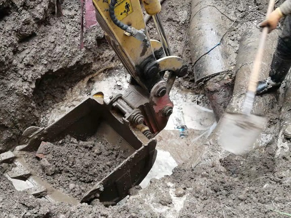 在滨河湾一次网抢修现场,挖掘机开挖出深约3米、长约5米的维修作业面积,排污泵不停地抽排冒出的水流。检修人员忙个不停、爬上爬下地钻进阀门井关断阀门……