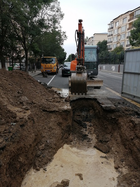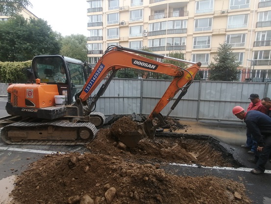 在组织部管网抢修现场,北门的路面积水四溢流淌,抢修保运单位正开动机器破路开挖,寻找管网泄漏点。分公司领导和抢修单位负责人按照现场开挖的进度和情形,分析漏水处及原因,经过近一个半小时的开挖和巡探,终于找到了管网跑水故障点,原因是组织部办公楼二次网补偿器接口老化腐蚀造成跑水。分公司及时告知物业维修责任及维修要求,以保证如期供热。