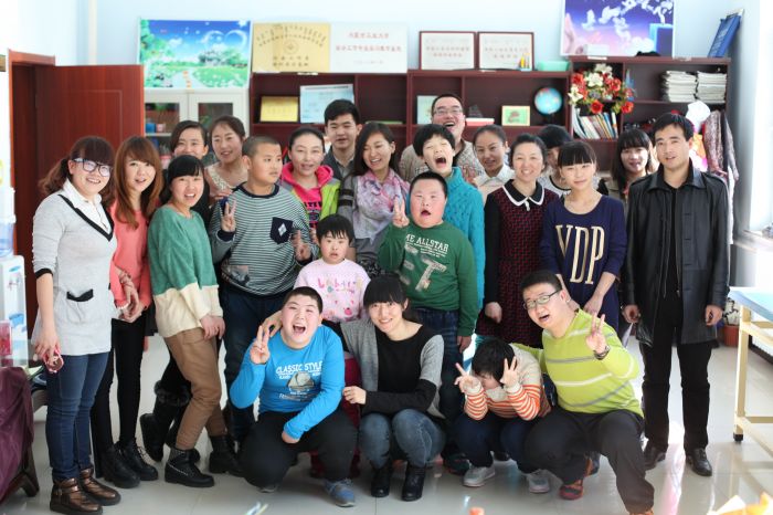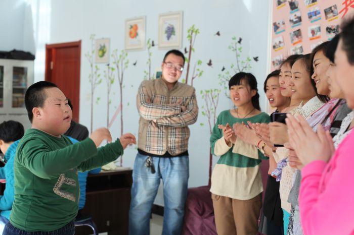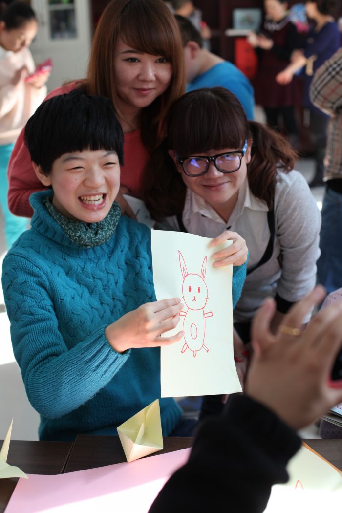 一行20余名青年志愿者们在学校老师的支持与配合下,顺利开始了活动。志愿者们为孩子们包了最爱吃的饺子,他们还牵起智障儿童的小手,带领他们参加互动游戏,和他们一起做手工、绘画,身体力行地诠释“点滴关爱,心暖世界”的理念。交流让他们成为朋友,歌声传达了他们的爱,活动感动他们也感动了我们。我们采取一对一的方式的交流,听着他们开心的笑声,在场的志愿者们都露出会心的微笑。一首志愿者们精心挑选的《敢问路在何方》是希望小朋友们做勇敢的强者。演唱中小朋友表情颇为认真的为演唱的志愿者们指挥节奏。他们用行动告诉我们,他们很快乐。