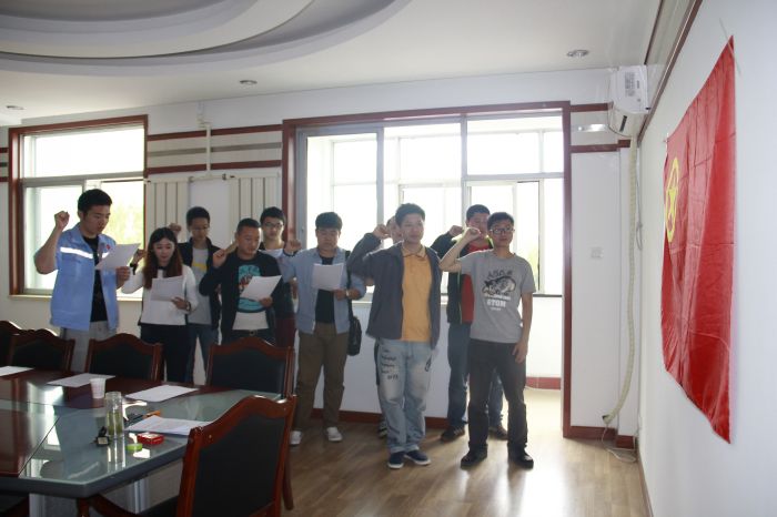 最后支部书记与10名团员代表一起面对团旗、一起举起右手、一起大声地重温入团誓词。