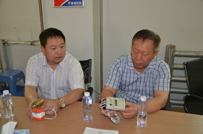 城发副董事长杜雄勇与副总经理梁永庆在睿城科技公司现场对热计量产品进行技术探讨。李波摄