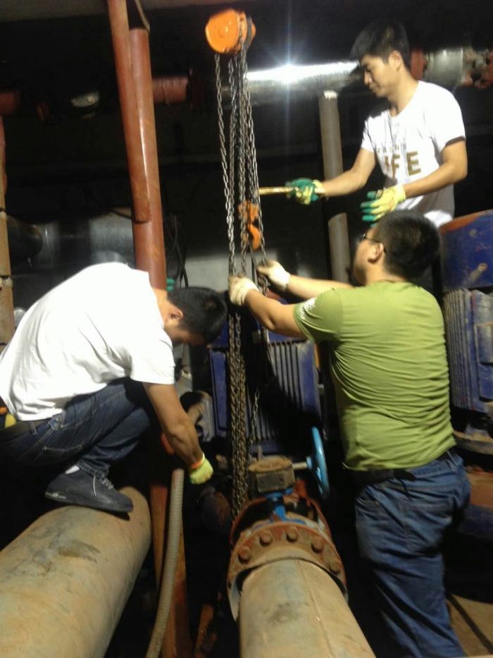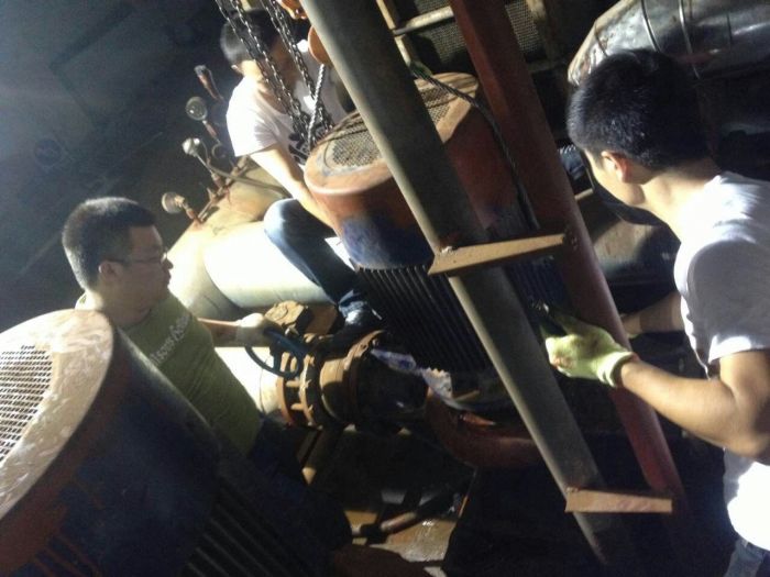 到达现场,先将机组断电,确保安全后,将吊链挂在龙门架上,下端连接好循环泵。由于站内设备、管道布局复杂、紧凑,泵体周围能够作业的空间非常有限,我们只能弓着身子去将泵体与底座间的螺丝拿扳手一个个拧下来,然后用吊链将泵体吊起后放倒,依次将叶轮、支撑盖等部件取下,把损坏的机封拆解下来。给新的机封上少许润滑油,后将其准确无误的安装到指定位置,再将拆解下去的部件依次安装上去,将泵体与底座连接,用螺丝紧到位。检查一下风扇是否转动自如,然后启动循环泵,观察其是否漏水,各个部件是否运转正常。看起来一切运转正常后,才结束了今天的检修。