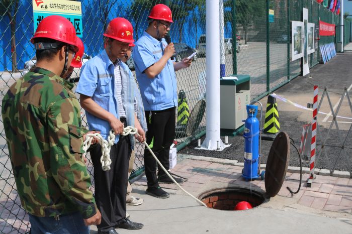 本次演练是以城发供热三合村分公司所属爱民街一次管网K1井因在严寒天气管道介质温升快、压力高,造成一次供热管网法兰结合处拉伸开裂,造成热水泄漏溢出,抢修人员在接到通知后进入现场进行抢修。在抢修过程中,因井内通风时间短,致使下井人员中一人脑部缺氧发生短时性休克,生命受到威胁为情景。演练分报告、应急响应、应急处置、应急配合、应急终止等科目。
