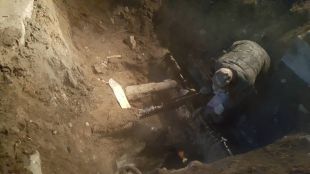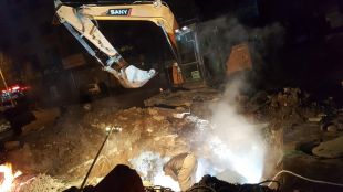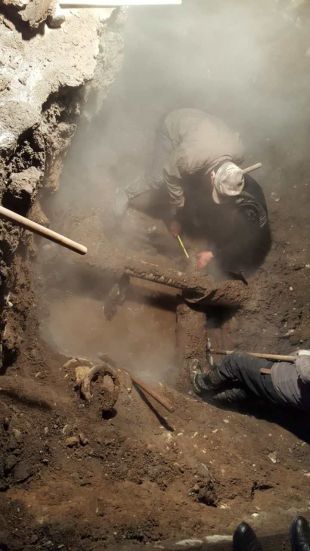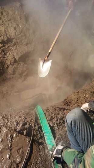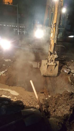 下午2点,开始挖坑找漏点,边抽水边挖,挖出热力管道。分公司经理阮强、副经理陈龙到达现场指示:去除保温,找到漏点。随即检修人员关掉统计局街西端DN300阀门,准备泄水抢修。由于阀门关闭不严,水温太高,人工无法继续开挖,只能调来挖机进行抢修作业。经过2小时的人机配合,终于挖出管道 ,发现在供热管上方有一大一小两个漏点,局部腐蚀严重。经过商议,确定在在原有管道上加套管,带水焊接。