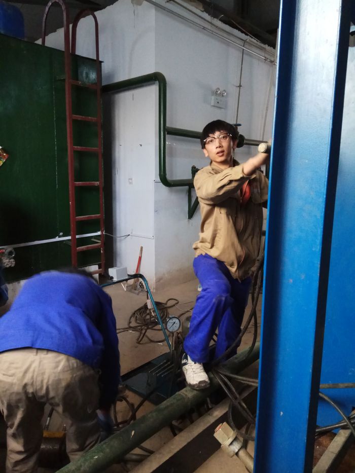清洗板式换热器是一项繁重而艰苦的体力劳动,尤其是地下站,清洗板换所用液压扳手,电机同液压变速器加起来将近200斤重,都要靠小伙子们抬着上下楼梯,小伙子们吃苦耐劳一点怨言也没有。由于地下站本身就通风散热不好,工作环境温度极高,尤其是加 州一期热力站,室温接近35℃,刚刚干了一小会儿,衣服就全被汗水打湿了,小伙子们只能不停喝水降温,穿着湿漉漉的衣服继续工作着。